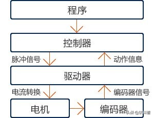 程序控制器(脈沖信號)驅(qū)動器(電流轉(zhuǎn)換)電機(jī)編碼器(編碼器信號)驅(qū)動器(動作信息)控制器