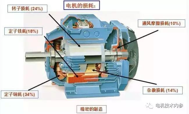 電動(dòng)機(jī)在將電能轉(zhuǎn)化為機(jī)械能的同時(shí),也會(huì)損失一些能量。典型的交流電機(jī)損耗可分為三部分:固定損耗,可變損耗和雜散損耗.可變損耗隨負(fù)載變化,包括定子電阻損耗(銅損耗)、轉(zhuǎn)子電阻損耗和電刷電阻損耗;固定損耗與負(fù)載無(wú)關(guān),包括鐵芯損耗和機(jī)械損耗。鐵損由磁滯損耗和渦流損耗組成,磁滯損耗與電壓的平方成正比,磁滯損耗也與頻率成反比。其他雜散損耗是機(jī)械損耗和其他損耗,包括軸承的摩擦損耗和由風(fēng)扇和轉(zhuǎn)子旋轉(zhuǎn)引起的風(fēng)阻損耗。